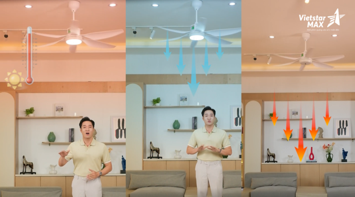 Trong tâm lý người tiêu dùng, các thiết bị treo trần luôn đi kèm nỗi lo về rung lắc hoặc sự cố sau thời gian dài sử dụng. Giải quyết bài toán này, VietstarMax đã khéo léo xây dựng lối dẫn dắt trực tiếp, gần gũi như một cuộc trò chuyện chia sẻ kinh nghiệm thực tế. Người dẫn chương trình không chỉ thuyết minh mà còn trực tiếp thao tác, kiểm chứng hệ thống khóa an toàn đa lớp. Sự tương tác tự nhiên giữa con người và sản phẩm được dàn dựng tỉ mỉ, giúp thông điệp về sự an toàn trở nên hữu hình và đáng tin cậy. Khách hàng không chỉ “nghe” về an toàn mà còn được “thấy” sự an tâm thông qua trải nghiệm thực tế.